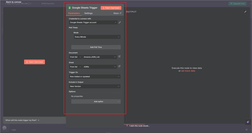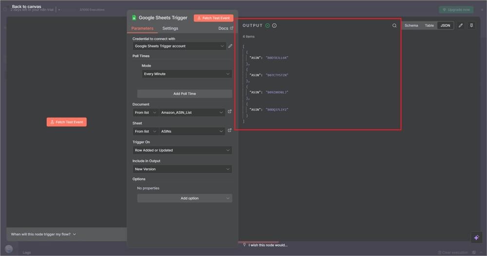Let’s set up the trigger that starts the workflow whenever a new ASIN is added to your Google Sheet.