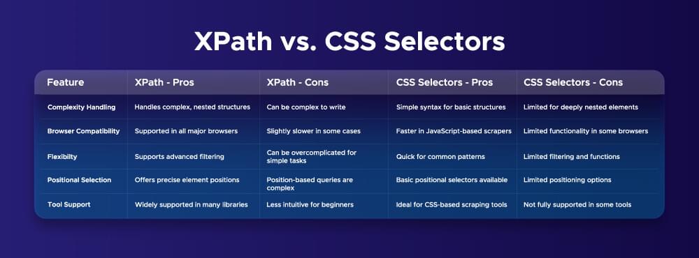 Below is a comparison table outlining the pros and cons of XPath and CSS selectors to help you decide which option suits your web scraping needs best.